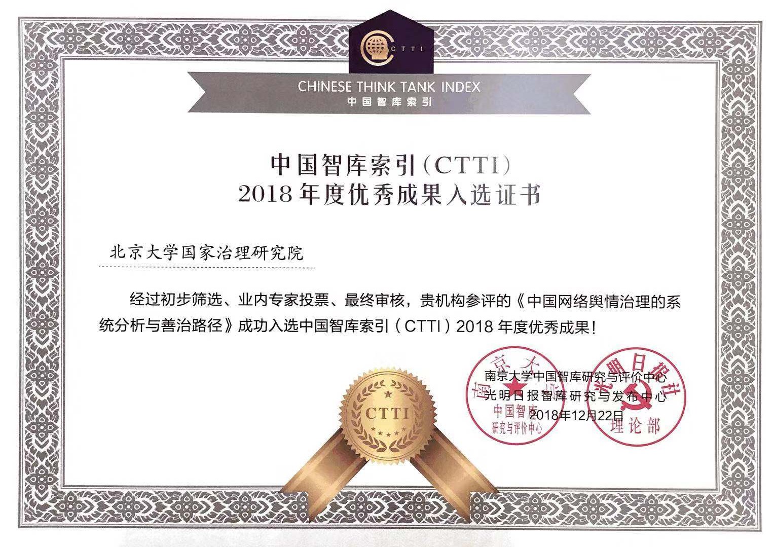 12月22日,由南京大学与光明日报社联合主办的2018中国智库治理暨思想理论传播高峰论坛在江苏南京举行。在来自中央及各省市思想理论和智库管理部门领导、全国高校科研管理部门负责人、“中国智库索引”(CTTI)来源智库、智库研究界700余位专家学者的共同见证下,“CTTI高校智库百强榜”发布。北京大学国家治理研究院等25家来源智库进入CTTI高校智库A+级榜单,研究院研究人员张权、燕继荣提交参评的《中国网络舆情治理的系统分析与善治路径》成果获评高校智库2018年“年度优秀成果”。