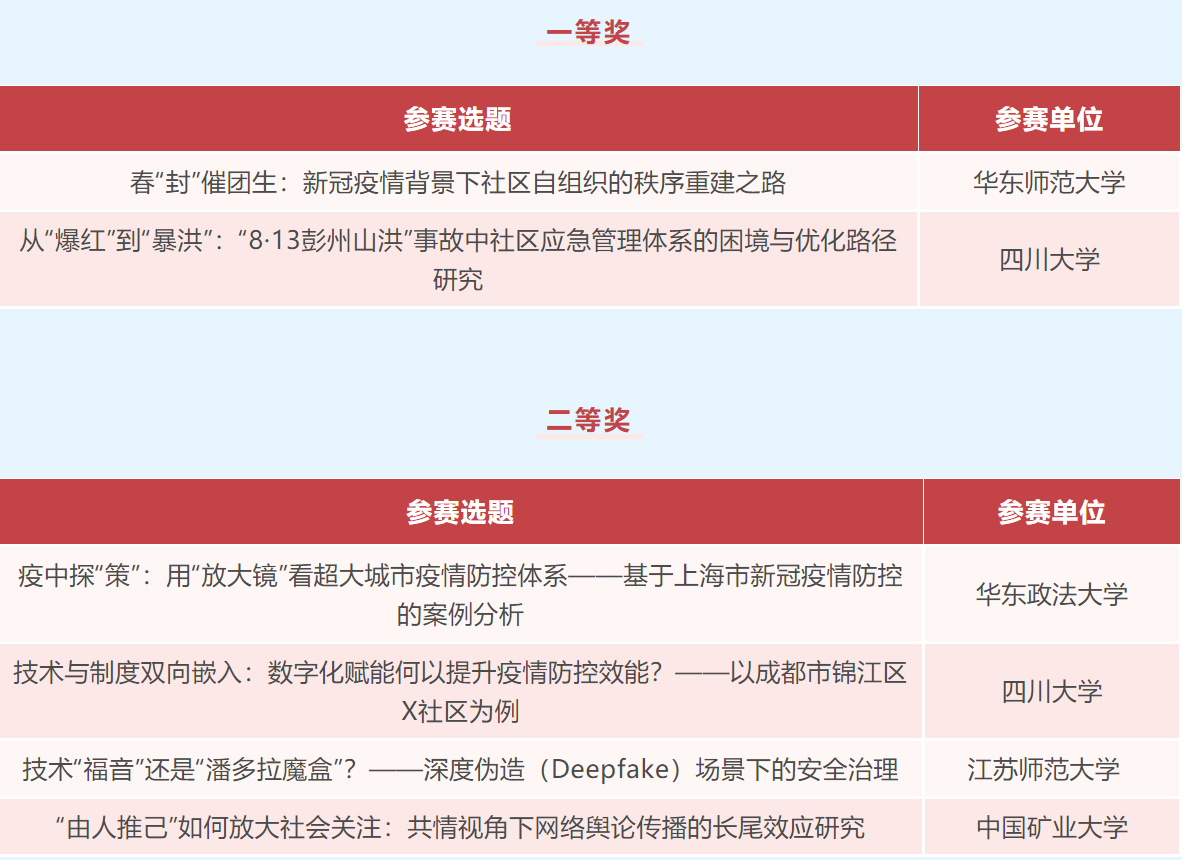 据悉,本次大赛自5月份启动以来,各单位参赛选手踊跃报名,最终,组委会收到来自全国各地169支队伍的报名材料。大赛由北京大学国家治理研究院高鹏程副院长和华东政法大学政府管理学院汪伟全副院长牵头负责。经过两校组织专家进行匿名交叉评阅,来自新南威尔士大学、香港理工大学、中国社会科学院大学、四川大学、华东师范大学、国防科技大学、湖南大学、东北大学、国际关系学院、南京理工大学、中南财经政法大学、中国矿业大学、云南大学、贵州大学、西藏大学、华东政法大学等学校的30支队伍最终入围决赛。