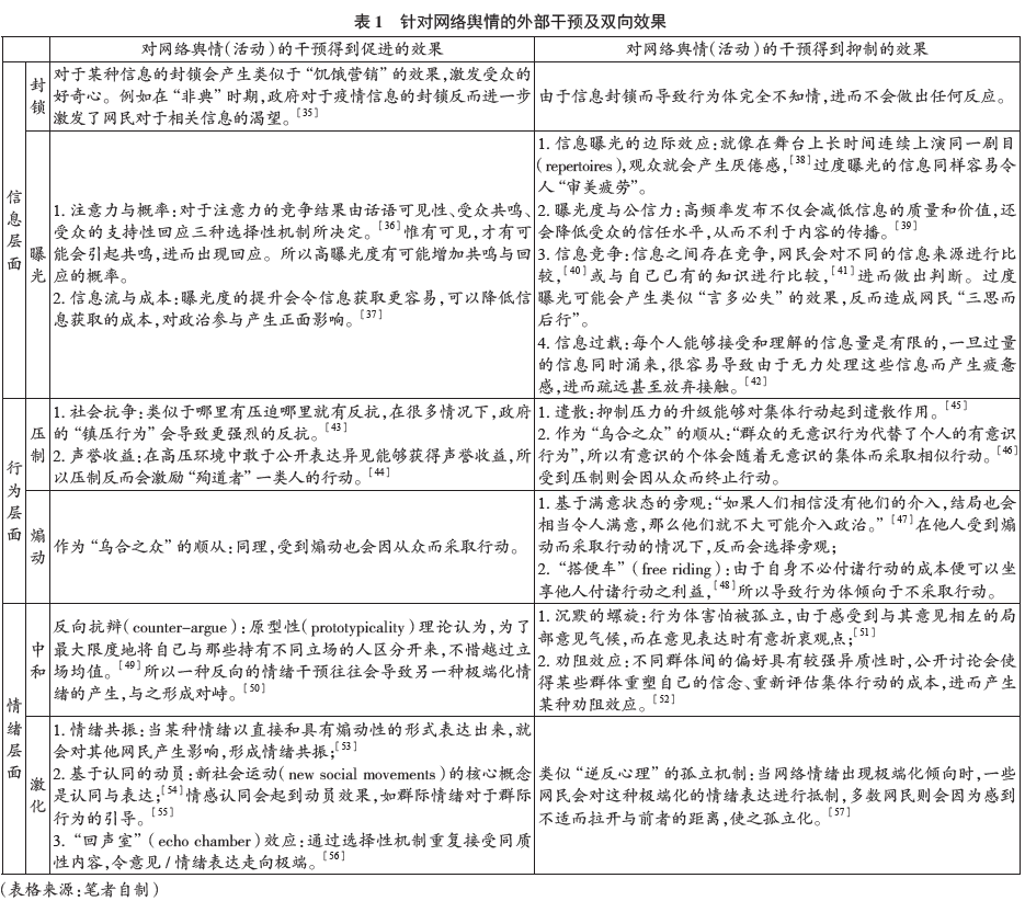 为了更进一步说明这个情况,以下从干预效果(促进作用/抑制作用)和作用层面(信息层面:封锁/曝光;行动层面:压制/煽动;情绪层面:中和/激化)两个维度构建2×6的矩阵,对于不同干预行动可能会造成不同效果的12种情况(6种意图与效果相符的情况和6种意图与效果不符的情况)做了不完全归纳,实际上也是对为何造成不同情况的主要理论阐释进行不完全归纳: