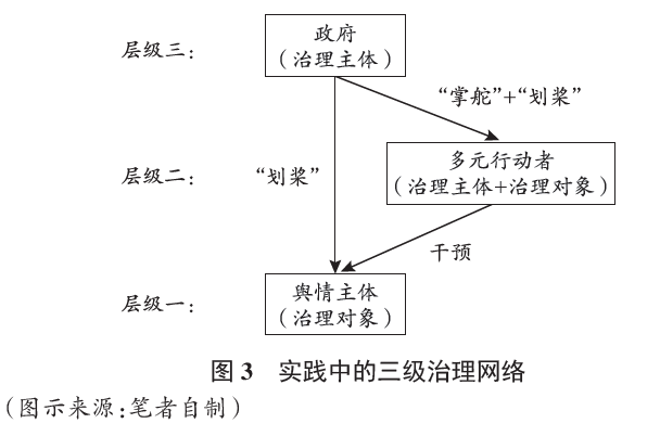 在目前实践中,治理理论所提倡的多元主体共同参与治国理政还只停留在名义上,无论是领导体制的变革(中央网信领导小组与网信办的成立)、相关政策法规的密集出台、信息基础设施与资源的垄断管制、网络接入与信息服务的许可备案、终端用户的实名注册等,本质上都是在强化传统的社会控制机制,并在此基础上将网络空间离散的主体关系与传播结构再集中化。如图3 所示,当前网络舆情治理形成了三级治理网络:政府—多元行动者—网络舆情主体。各主体在复杂治理网络中的角色具有二重性:政府既参与“划桨”(rowing)也进行“掌舵”(steering),即一方面要关注治理对象并对其他主体发号施令,另一方面要督促其他主体对于指令的落实;而多元行动者既是治理主体又是治理对象,一方面要参与网络舆情治理,另一方面要接受政府的指挥和控制并与之“周旋”;作为舆情主体的普通公众则完全是干预行为的被动接受者。三级治理网络中的各个主体在治理过程中同时行动。遭遇治理困境实际上在很大程度上是政府没有摆脱以传统意义上自上而下的命令和控制为核心的惯性思维使然。