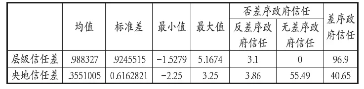 本文的因变量为“差序政府信任”,依概念和算法区别分为央地信任差距和层级信任差距,前者指地方与中央政府的公众政府信任差距,后者指基层政府与高层政府的公众政府信任差距,两者共同构成“差序政治信任”。