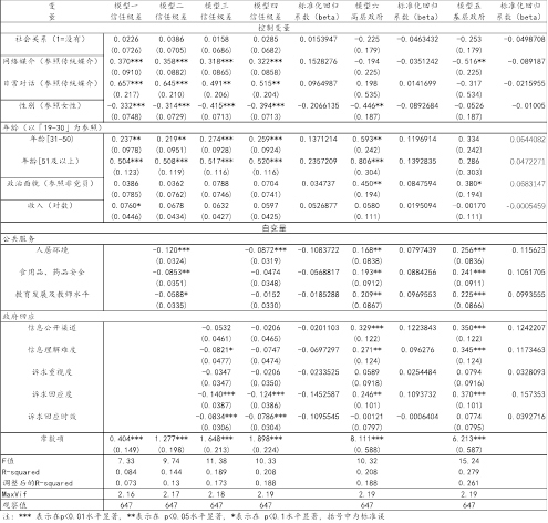 自变量分为两类:(1)公共服务,本文确定的公共服务为民生性公共服务,包含人居环境、食品药品品质安全、教育和教师发展水平。对此同样采取赋分制记分原则,得分区间介于1-5,得分越高,代表改善程度越高。(2)地方政府回应,主要指涉地方政府就公共政策相关信息的主动公开和回应居民诉求,具体内容包括信息公开渠道、公开信息理解便捷度、对居民意见重视程度、回应程度及回应时效性,采取赋分制的记分原则,得分区间介于1-5,得分越高表示政府回应性越差。为了保持与因变量测量向度的同质性,在回归分析中对其进行了逆序处理。