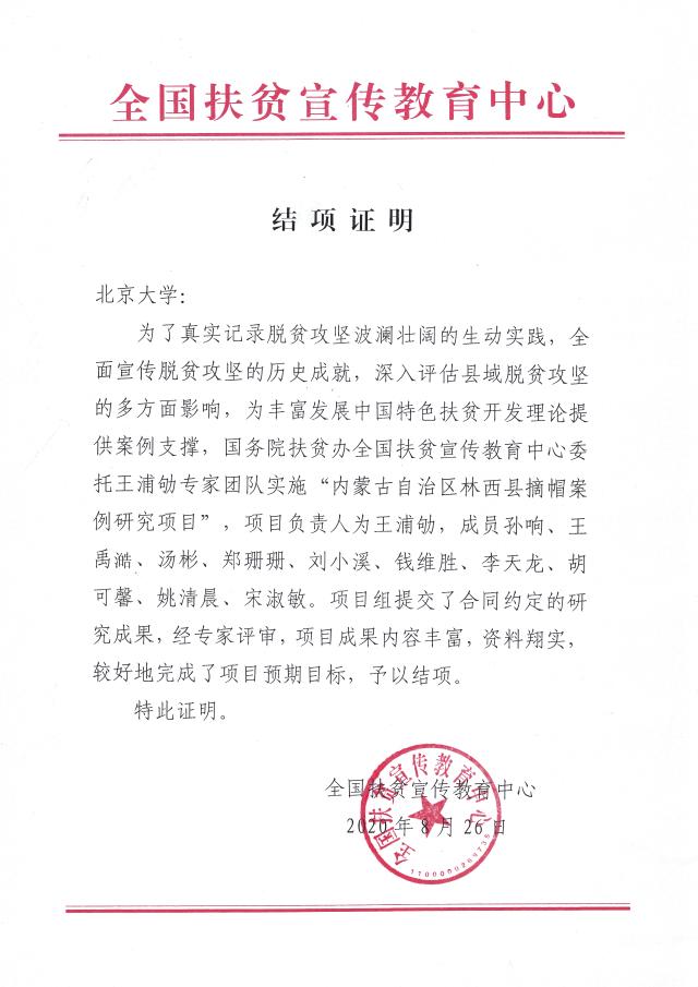 2020年8月26日,国务院扶贫办全国扶贫宣传教育中心委托王浦劬教授团队完成的《内蒙古自治区林西县摘帽案例研究项目》顺利结项。课题组成员有孙响、王禹澔、汤彬、郑珊珊、刘小溪、钱维胜、李天龙、胡可馨、姚清晨、宋淑敏。