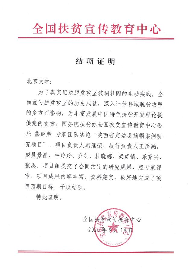 2020年9月14日,由国务院扶贫办全国扶贫宣传教育中心委托燕继荣教授团队完成的《陕西省定边县摘帽案例研究项目》顺利结项。课题组成员有王禹澔、景晶、牛玲玲、齐钊、杜晓娜、梁贞情、乐繁兴、张恩。