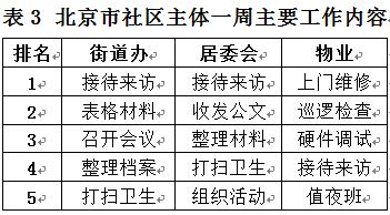 近年来,北京市在城市基层社区治理领域有很多尝试,并取得了显著成效,但仍有大量社区治理矛盾需进一步解决。本研究以北京市社区治理为样本,采用文献研究、工作日志、深度访谈、问卷调研相结合的研究方法与手段。在工作日志部分,研究共记录了东城、西城与石景山等不同社区13名社区治理参与者一周的工作记录,其中包括街道办工作人员、社区居委会工作人员以及物业公司工作人员三类。记录时要求参与者在一周内记录周一至周五自己的工作内容,每天记录一页,每小时记录一次,记录内容包括时间、工作项目、工作流程、参与程度、处理结果、备注等。
