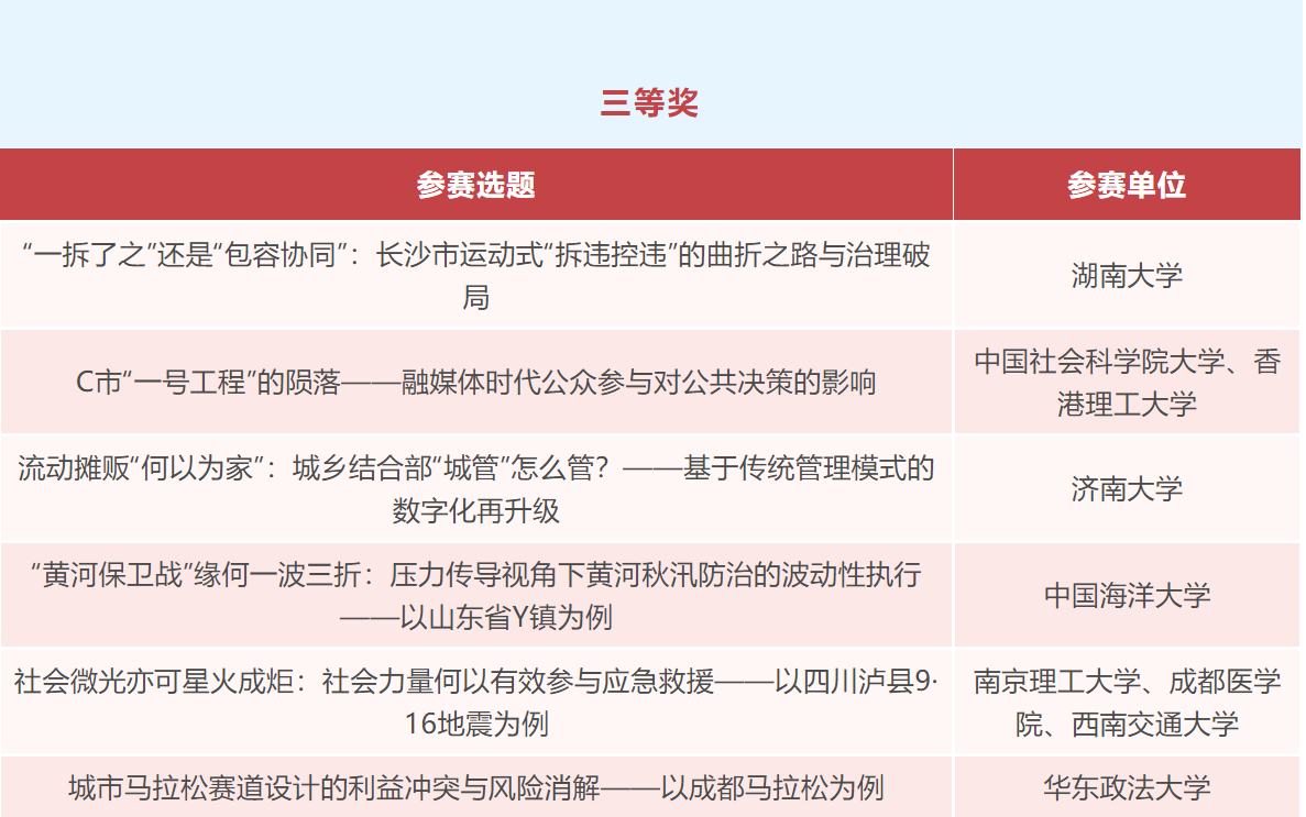本次大赛的决赛评委由北京大学政府管理学院金安平教授、厦门大学公共政策研究院陈振明教授、湖南农业大学公共管理与法学院徐晓林教授、中国人民大学公共管理学院杨宏山教授、黑龙江社会科学院朱宇研究员、中山大学政治与公共事务学院朱亚鹏教授、北京大学政府管理学院宋磊教授、北京大学政府管理学院严洁副教授等8位专家组成。决赛分两组同时进行,各参赛队伍在答辩展示中的出色表现,赢得了评委专家们的高度称赞。经过近4个多小时的激烈角逐,最终评选出一等奖2名,二等奖4名、三等奖6名、优胜奖8名(具体名单附后)。最后,华东政法大学政府管理学院副院长汪伟全教授宣布了各获奖队伍,并致大赛闭幕辞。