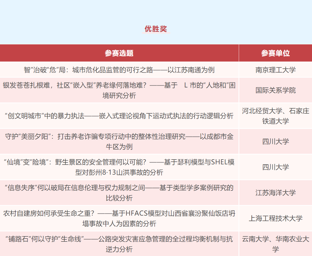 此次全国社会公共安全案例大赛的成功举办,产生了积极广泛的影响,强化了公共安全学术研究的沟通交流和专业磋商,推动了公共安全教学、科研和学科发展。