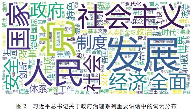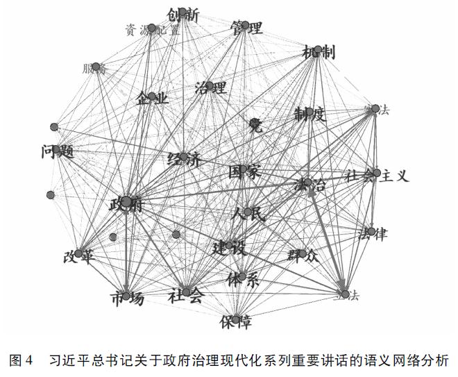 关键词:政府治理现代化;习近平总书记系列重要讲话;文本分析;战略要义 党的十八大以来,习近平总书记发表了一系列关于政府治理的重要讲话,为我国推进政府治理现代化提供了思想指导和价值引领。 本文根据习近平总书记系列讲话的文本,认真学习其关于政府治理现代化的经典论述,把握其深刻要义和宏观战略。为此,笔者选取2012年11月30日至2017年12月8日之间习近平总书记关于政府治理现代化的系列重要讲话文稿,运用文本分析技术,对关键词进行词频统计和计量分析,力图揭示我国政府治理现代化的战略要义。 为避免文本量化分析失准失焦,笔者遵循文本分析规范,先由两人对文稿进行识别,再对比两人的识别结果,针对不一致的情况进行第三人编码,由此确定选入的分析对象。笔者使用词云、高频词分类统计、语义网络等文本分析工具,按照词频统计规则,区分高频词,并采用可视化方法,呈现关键词汇的变化。 本文首先对习近平总书记关于政府治理现代化的系列重要讲话文稿进行中文分词和数据清理,即从文稿中提炼出实词(如名词等) 与短语,删去无关词(如“坚持” “实现” 等)、标点符号、数字等信息,最后统计出与政府治理现代化相关的高频词,提炼政府治理现代化的核心概念及其基本内涵。 图1中列举出习近平总书记最经常提及的20个词语。不难发现,使用频次最高的词语是“发展”,其次为“党” “人民” “社会主义”“国家”“经济” “全面” “社会” “政府” 等,以及“安全” “制度”“改革”“世界”“市场”等。这些词语显示,在总书记看来,政府治理现代化涉及国家的政治、经济、社会等各个领域,政府治理现代化的措施包括“改革” “创新” 等,政府治理现代化的重要依托是“市场”“制度”等。 词云是一种按照文本中的关键词的词频高低,以字号大小或色彩分别表现的图形化文本分析工具。词云分布图中,字号大小与其词频成 正比。 如图2显示,除了上文提及高频词外,习近平总书记还特别关注“企业”“治理” “法治” “宪法” “文化” 等。这表明,在政府治理现代化过程中,习近平总书记特别重视“企业”与政府协同治理的机制和作用,强调宪法和法律的规范作用,把法治作为政府治理的基本方式,重视以文化发展助力政府治理现代化进程。需要指出的是,在屏蔽“政府治理现代化”整体用词后,“治理”一词出现的频率仍然排在将近30名,足见习近平总书记对治理理念的重视。 词云分布图还表明,习近平总书记在论述政府治理现代化时,尤为关注以下几个重点议题,例如市场配置资源、建设社会主义市场经济、维护国家总体安全、促进互联网发展与创新互联网治理等。对比分析高频词分布图和词云分布图,笔者进一步发现习近平总书记关于我国政府治理现代化的战略设计: 第一,政府治理现代化,必须坚持中国共产党领导、坚持中国特色社会主义道路。政府治理体系是中国共产党领导现代化建设,推进经济社会发展的治权体系,也是实现国家治理的执行机制。近代以来,我国社会主义革命、建设和改革的成果实践表明,党的全面领导,是人民群众战胜风险挑战、不断夺取胜利,实现中华民族伟大复兴的关键。因此,政府治理现代化也必须坚持党总揽全局、协调各方的作用,充分发挥中国共产党作为中国特色社会主义事业领导核心的作用。同时,必须遵循社会主义初级阶段这个最大国情予以规划和设计,坚持社会主义发展方向和时代要求,确定政府治理现代化的任务和要求。 第二,政府治理现代化必须坚持以人民为中心的发展理念。政府治理现代化是以习近平同志为核心的党中央基于我国当前国情的战略设计,最重要的依据是我国的社会主要矛盾和人民群众的切实需求。党的十九大报告直接提及“人民”的次数就高达203次,报告指出: “我国社会主要矛盾已经转化为人民日益增长的美好生活需要和不平衡不充分的发展之间的矛盾”。政府治理现代化的途径与目标必须取向于满足人民群众多样化、多层次、多方面的特点,必须认识到“人民是历史的创造者,是决定党和国家前途命运的根本力量”。可见,政府治理现代化的根本动力在于人民群众的积极参与,必须充分发挥人民群众首创精神,必须最大限度激发其参与社会主义政治建设的巨大热情。 第三,政府治理现代化必须处理好政府与市场、社会的关系。政府调控是市场经济的“有形之手”,政府职能转变的目标是让市场在政府调控中更好地发挥资源配置的作用。此外,政府作为社会管理主体,在党委领导、政府负责、社会协同、公众参与和法治保障的体系下,对于社会公共事务进行管理。然而,发挥政府作用并不意味着包办市场和社会,必须合理明晰政府的职权边界,减少政府对于市场运行和社会运行微观领域的干预,加强对于市场的服务和监管,加强社会领域的公共服务,积极培育和引导社会组织的发育。 第四,政府治理现代化必须以经济发展为基础和前提。按照历史唯物主义,经济基础决定上层建筑,因此,经济发展相对于政府治理现代化具有基础地位。从现实政治而言,市场经济发展,使得社会呈现多样性,不断涌现新问题、新现象,此外,互联网经济、共享经济等新兴事物的出现,也对政府提升化解矛盾、供给制度、有效治理、公共服务、市场监管等能力提出了新要