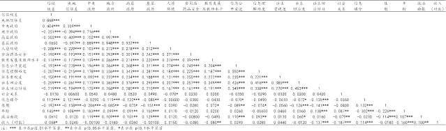 表6是人口特征、社会环境、政府信任的相关性分析,结果显示,公共服务三维度与信任级差、央地信任差显著负相关,与中央政府信任、地方政府信任、高层级政府信任、低层级政府信任均显著正相关。政府回应所有维度和信任级差、央地信任差显著负相关,和中央政府、地方政府、高层级政府和基层政府显著正相关。