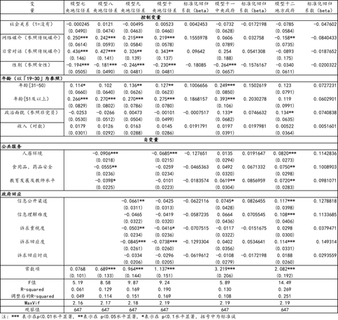 自变量分为两类:(1)公共服务,本文确定的公共服务为民生性公共服务,包含人居环境、食品药品品质安全、教育和教师发展水平。对此同样采取赋分制记分原则,得分区间介于1-5,得分越高,代表改善程度越高。(2)地方政府回应,主要指涉地方政府就公共政策相关信息的主动公开和回应居民诉求,具体内容包括信息公开渠道、公开信息理解便捷度、对居民意见重视程度、回应程度及回应时效性,采取赋分制的记分原则,得分区间介于1-5,得分越高表示政府回应性越差。为了保持与因变量测量向度的同质性,在回归分析中对其进行了逆序处理。